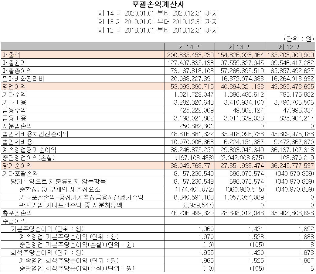 당사의 2020년 실적은 매출액 2,007억 원으로 전년 대비 29.6% 증가했고, 영업이익은 531억 원으로 29.8% 증가, 당기순이익은 37.6% 증가한 380억 원을 기록했습니다. 고객사 다변화 및 전방산업의 수요 증가에 따른 실적개선으로 파악됩니다.