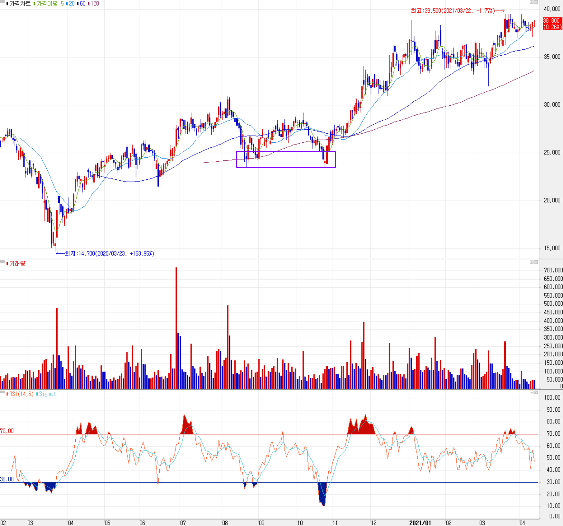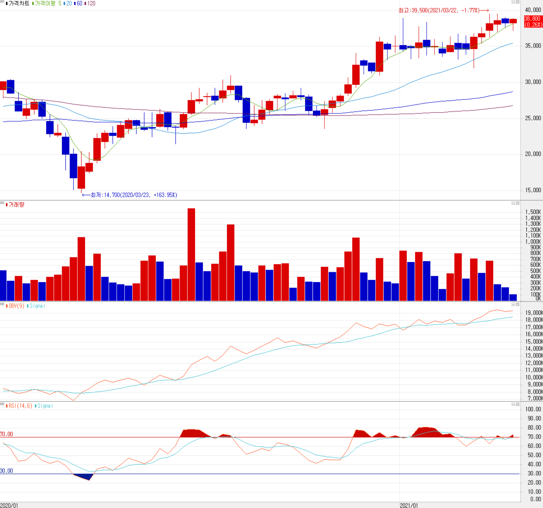 코로나19로 급락한 3월 23일 이후 빠르게 회복한 주가는 8월에서 10월 사이 쌍바닥을 만든 이후 현재까지 꾸준한 상승세를 보이고 있습니다. 최근 한 달간 수급에서는 외국인과 기관이 매수 우위를 보이고 있으나 거래량이 많지는 않습니다. 지난 3월 22일 기록한 최고치인 39,500원을 기록한 후 최근까지 횡보하면서 37,000 초반을 잘 지지하는 모습입니다. 컨센서스 및 차트 관점을 종합해서 개인적인 목표 주가는 47,000원으로 설정하였고, 조정 시 36,500원 선에서 지지가 예상됩니다. 추세 판단은 시간이 좀 더 필요할 것 같습니다.