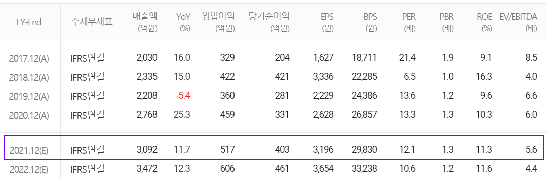 당사의 2021년 컨센서스는 매출액 3,092억 원으로 전년 대비 11.7% 증가하고, 영업이익은 517억 원으로 12.6% 증가, 당기순이익은 21.8% 증가하면서 403억 원을 기록할 것으로 추정했습니다.