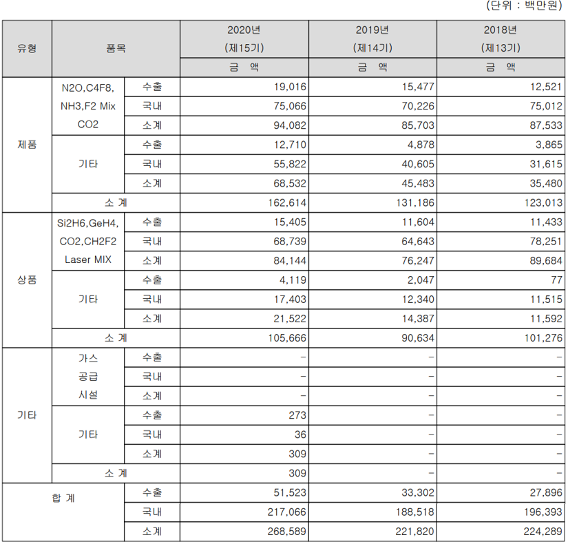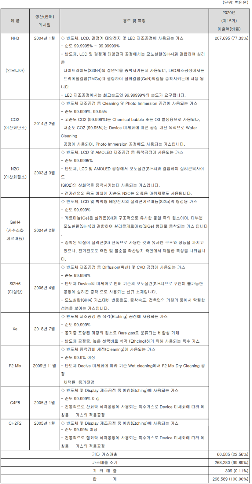 당사의 사업부문은 산업용 특수 가스를 전문으로 제조, 공급하는 기업으로서 당사가 공급하는 특수가스의 종류는 100여 가지이며, 이 중 9개 품목의 특수 가스가 반도체 및 디스플레이 공정에 사용되는 주요 제품 군입니다. 지난해 9개 특수 가스의 매출은 전체 매출의 77.33%의 비중을 보였으며, 기타 특수 가스의 매출이 22.56%를 차지하고 있습니다.