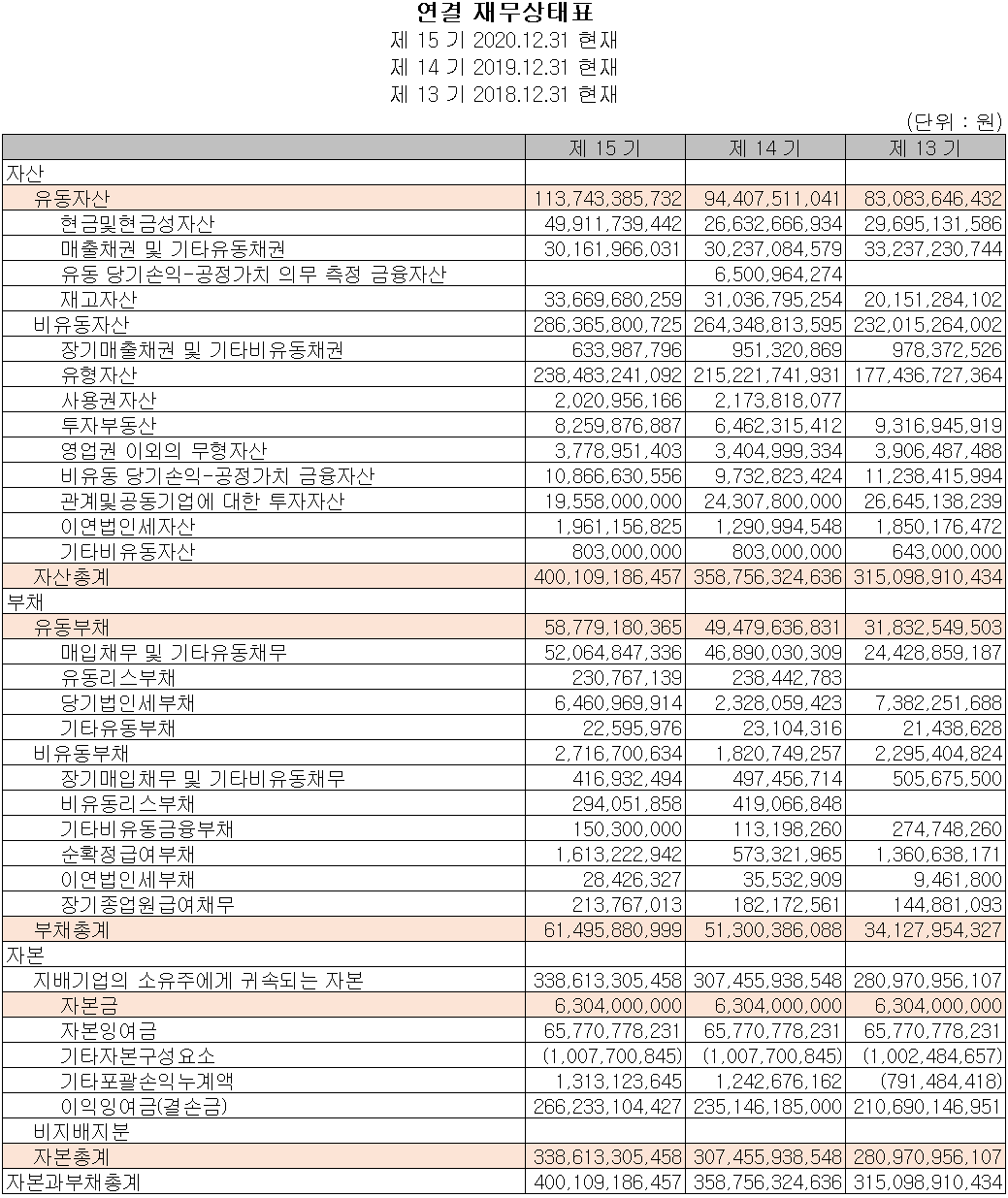 2020년 당기 말 현재 당사의 유동비율은 193.5%, 부채비율 18.2%, 자기자본비율 84.6%, 자본유보율 5,266.6%로 건실한 재무 상태를 유지하고 있습니다.