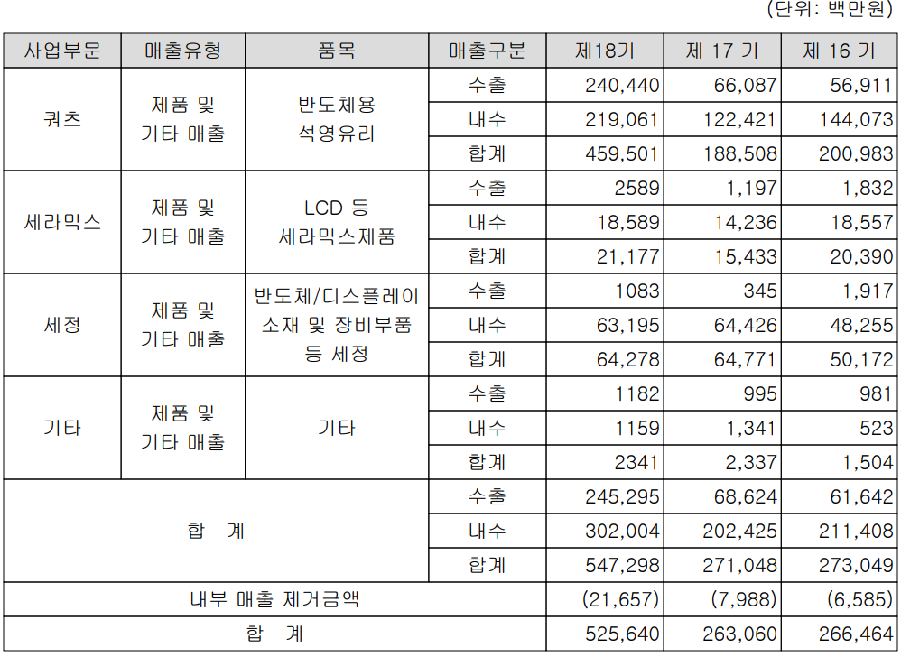 당사의 제품 매출을 유형별로 보면, 쿼츠 사업부문의 수출과 내수의 비중은 각각 52.3%, 47.7%를 보였고, 세라믹스는 12.2%, 87.8% 그리고 세정 사업부문은 1.7%, 98.3%를 기록했습니다. 전사적으로 볼 때 수출은 44.8%, 내수는 55.2%를 기록했습니다.