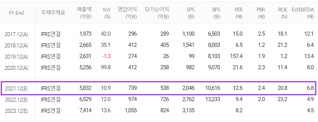 당사의 2021년 컨센서스는 매출액 5,832억 원으로 전년 대비 10.9% 증가하고, 영업이익은 739억 원으로 79.4% 증가, 당기순이익은 108.5% 증가한 538억 원을 기록할 것으로 추정했습니다.