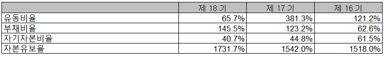 재무 안정성에서는 MOMQ 장기 차입금을 유동성으로 대체하여 유동비율이 큰폰으로 감소하여 65.7%를 기록했으며, 부채비율 145.5%, 자기자본비율 40.7%, 자본유보율 1,731.7% 그리고 차입금 의존도는 34.8%를 기록하였습니다. 부채 증가에 따른 유동성이 감소하였지만, 글로벌 쿼츠 시장 장악을 통한 미래 사업성과 성장성을 감안하면 충분히 인정할만한 비율로 생각되며, 기타 재무비율은 안정적인 흐름을 보이고 있습니다.