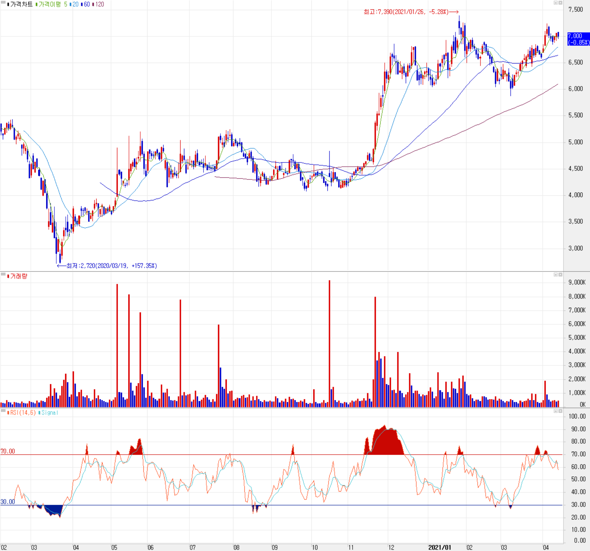 지난해 11월 반도체 슈퍼사이클 도래에 따른 전방 산업의 움직임이 활발해지면서 대장주인 삼성전자와 SK하이닉스의 주가가 먼저 움직이고 당사의 주가도 급등하면서 단숨에 6,000원 대를 넘어섰습니다. 3월 초순까지는 급등에 따른 조정 및 시장 수급 변동에 따른 조정을 받다가 최근 반등하면서 7,000원 부근에서 주가가 형성되고 있습니다. 대부분의 테마가 반영된 상황에서 조만간 실적에 따른 주가의 방향이 결정될 것으로 판단되며 1분기 실적 발표 전까지는 6,500~7,500원 사이에서 변동성을 보여줄 것으로 예상합니다.