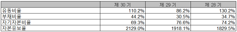 2020년 당사의 재무 안정성 비율에서는 유동비율 110.2%, 부채비율 44.2%, 자기자본비율 69.3%, 자본 유보율 2,129%를 기록하면서 안정적인 재무상태를 유지하고 있습니다.
