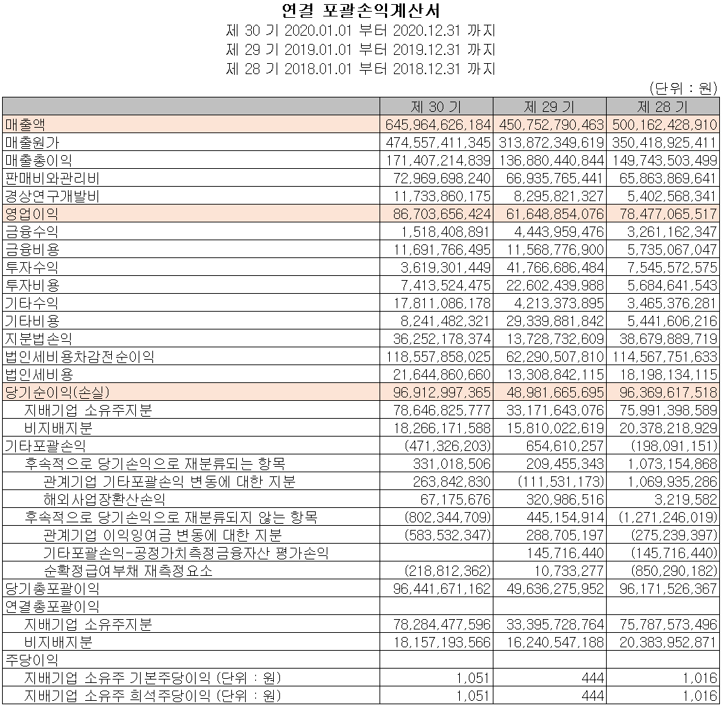 당사의 2020년 실적은 매출액 6,460억 원으로 전년 대비 43.3% 증가했고, 영업이익은 867억 원으로 40.6% 증가, 당기순이익은 97.9% 증가한 969억 원을 기록했습니다.