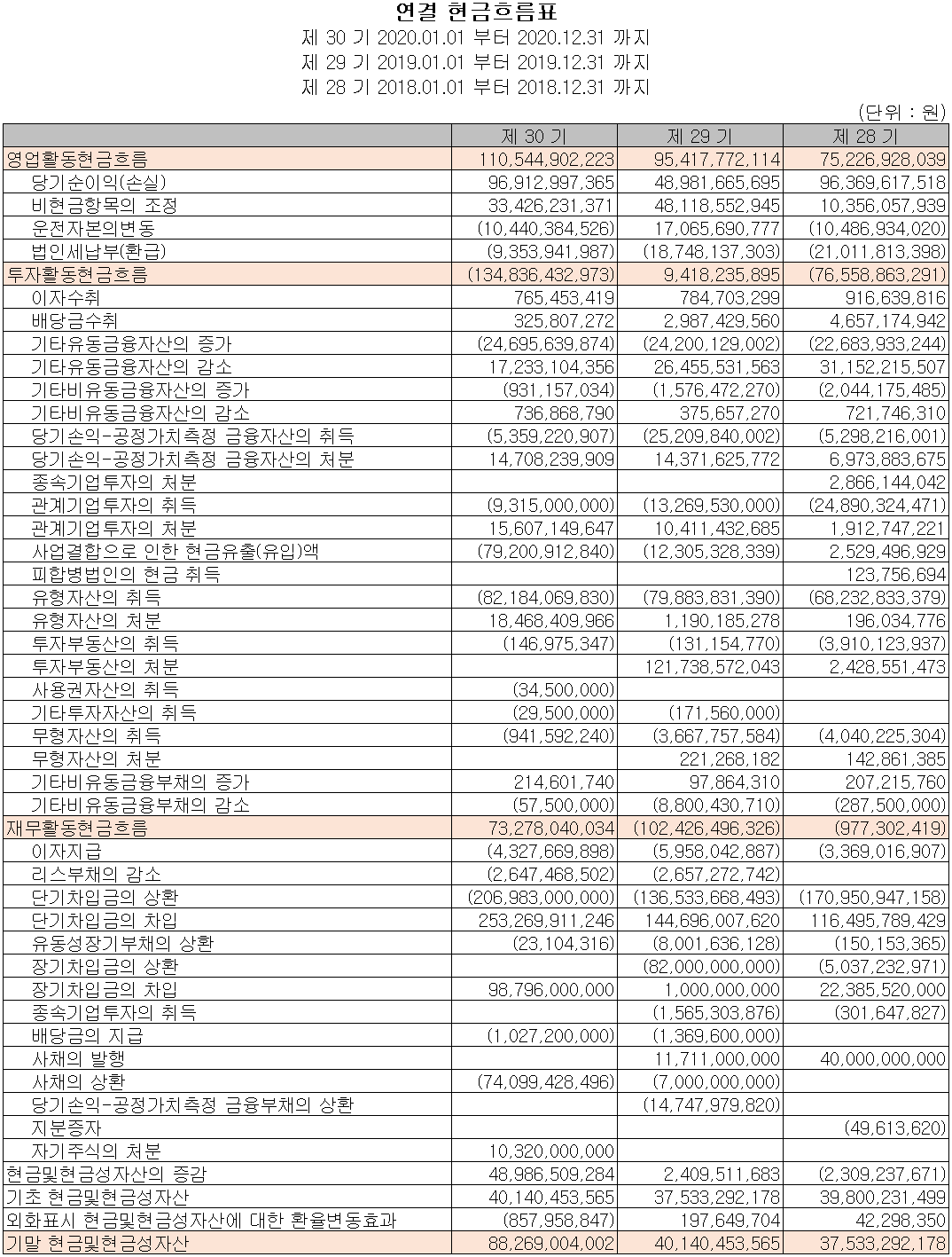 지난 2020년 영업활동 현금흐름은 총 1,105억 원의 현금이 유입되었으며, 차입금을 조달하여 부채를 상환하고 배당금을 지급하였습니다. 2020년 12월 31일 기준 현금 및 현금성 자산은 전기 대비 481억 원이 늘어나 883억 원을 보유하고 있습니다.