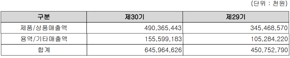 당사는 사업지주회사로서, 사업 부문에는 반도체용 가스공급 설비 및 배관 공사 등의 용역 부문으로 구분됩니다. 지난해 가스공급 시스템의 매출은 전년 대비 34.2% 증가한 4,904억 원이고, 용역 및 기타 매출은 47.8% 증가한 1,556억 원을 기록했습니다.