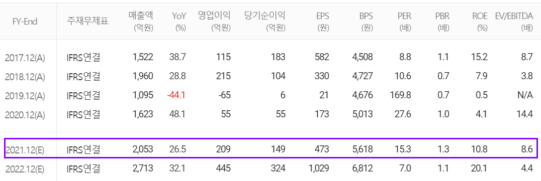 당사의 2021년 컨센서스는 매출액 2,053억 원으로 전년 대비 26.5% 증가하고, 영업이익은 209억 원으로 280% 증가, 당기순이익은 161.4% 증가한 149억 원을 추정하였습니다. (상기 그림의 2020년 당기 순이익은 57로 계산함)