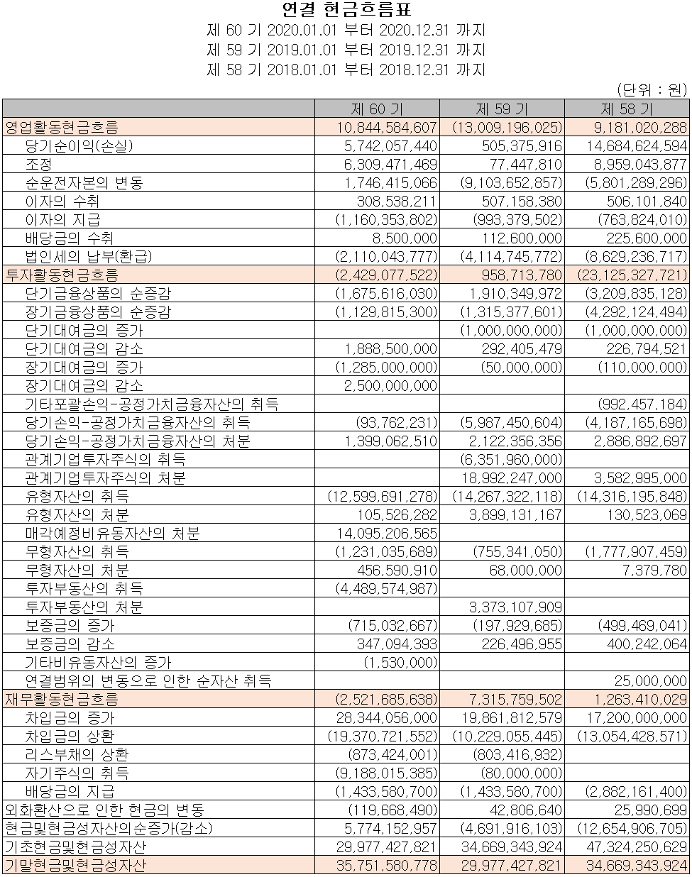 영업활동으로 현금을 창출하였으며, 장단기 차입금을 조달하여 설비투자 등을 하고 있으며 배당금을 지급하였습니다. 당사의 2020년 당기 말 기준 현금 및 현금성 자산은 358억 원입니다.