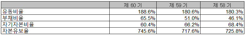 당사의 주요 재무 비율 면에서는 유동비율 188.6%, 부채비율 65.5%, 자기자본비율 60.4%, 자본유보율 745.6%를 기록하였습니다. 부채비율이 조금씩 늘고 있으나, 성장기업으로서 부채 증가의 충분한 요인이 있으며, 낮은 비율을 유지하고 있어서 전반적인 재무상태는 안정적이라고 판단됩니다.