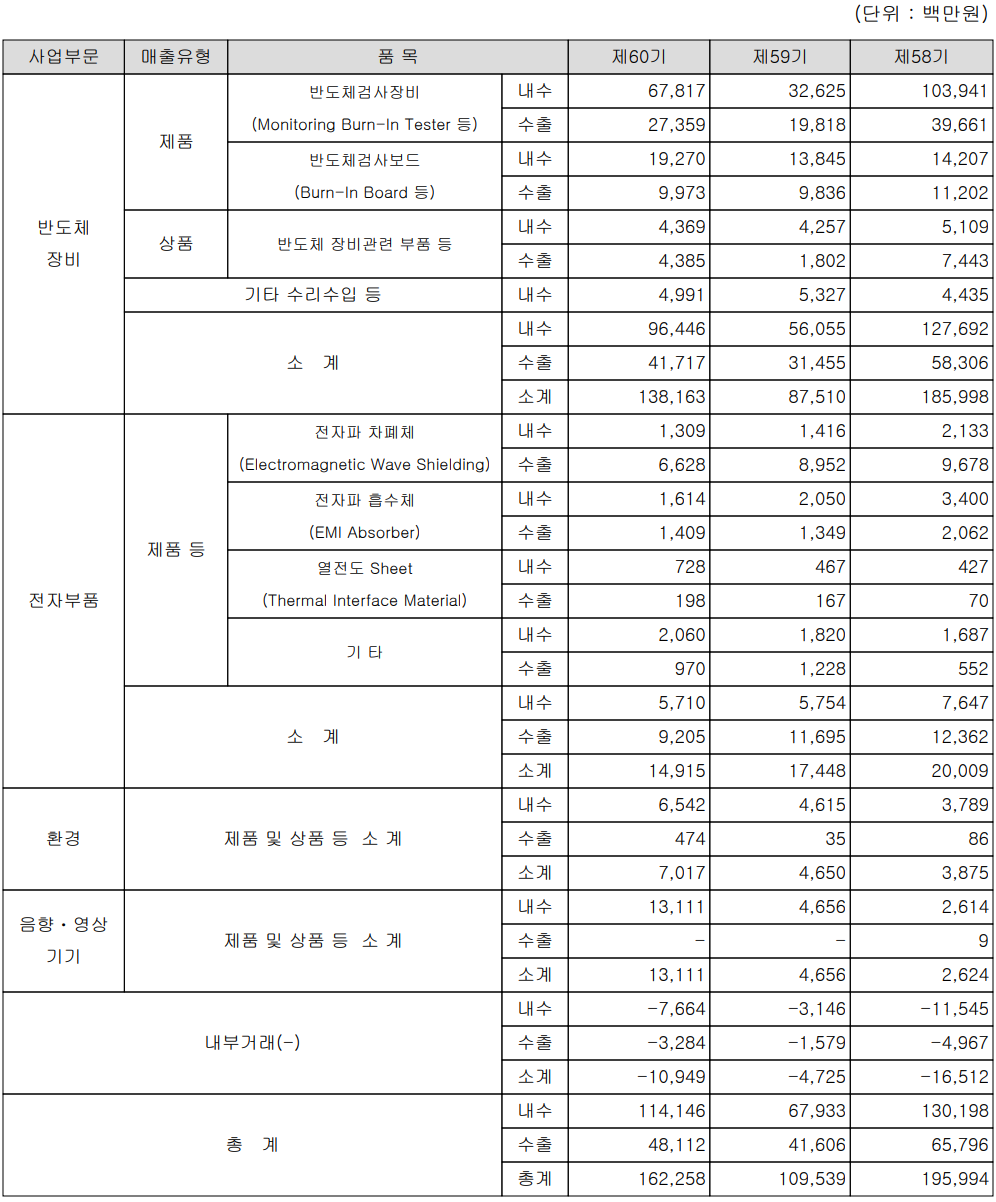 당사의 사업부문은 크게 반도체 검사 장비 및 관련 부품을 제조하는 반도체 장비 사업과, 전자파 관련 제품을 제조하는 전자부품 사업, 그리고 환경 관련 제품 및 음향/영상 기기 사업부문으로 구분됩니다.