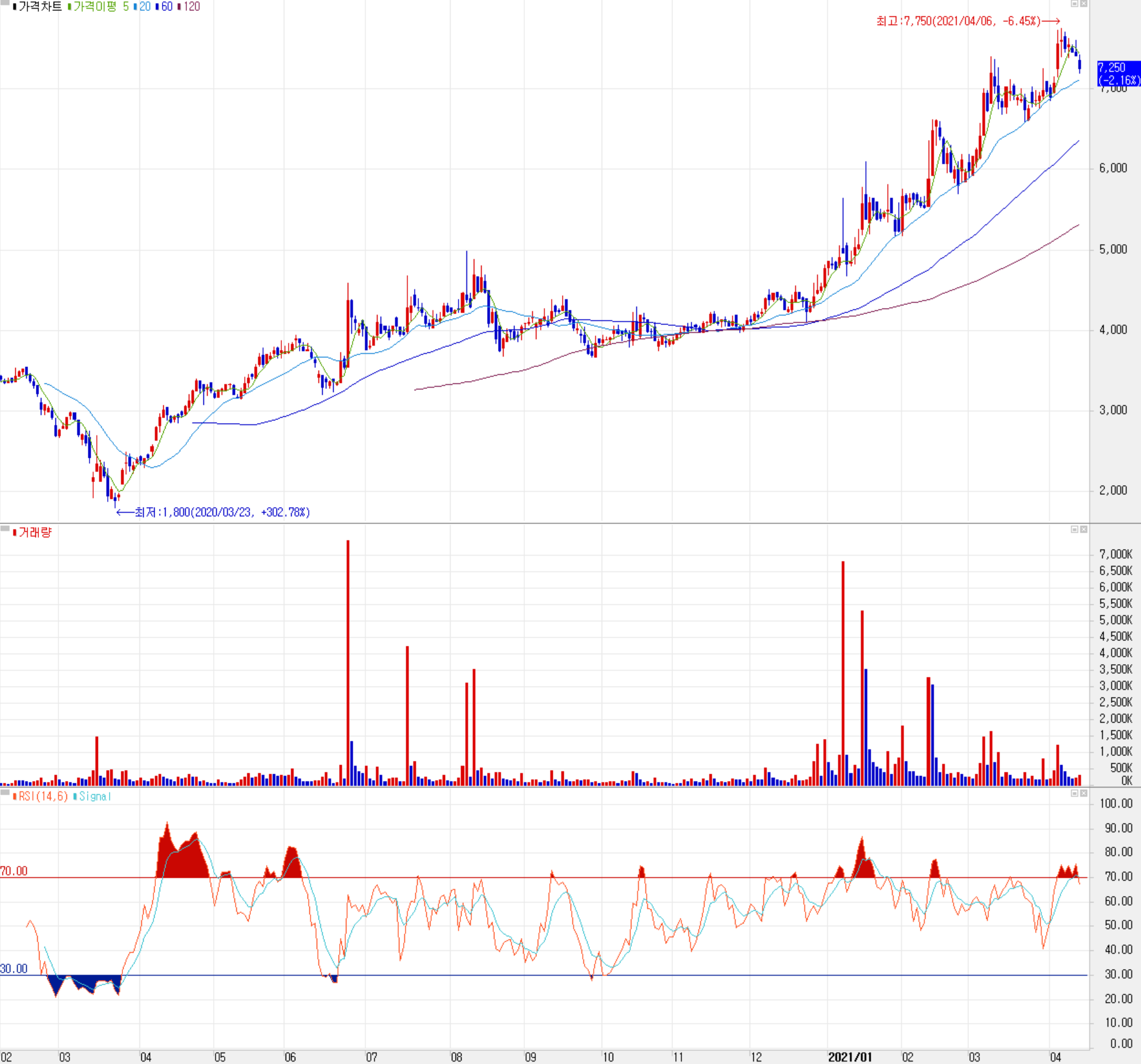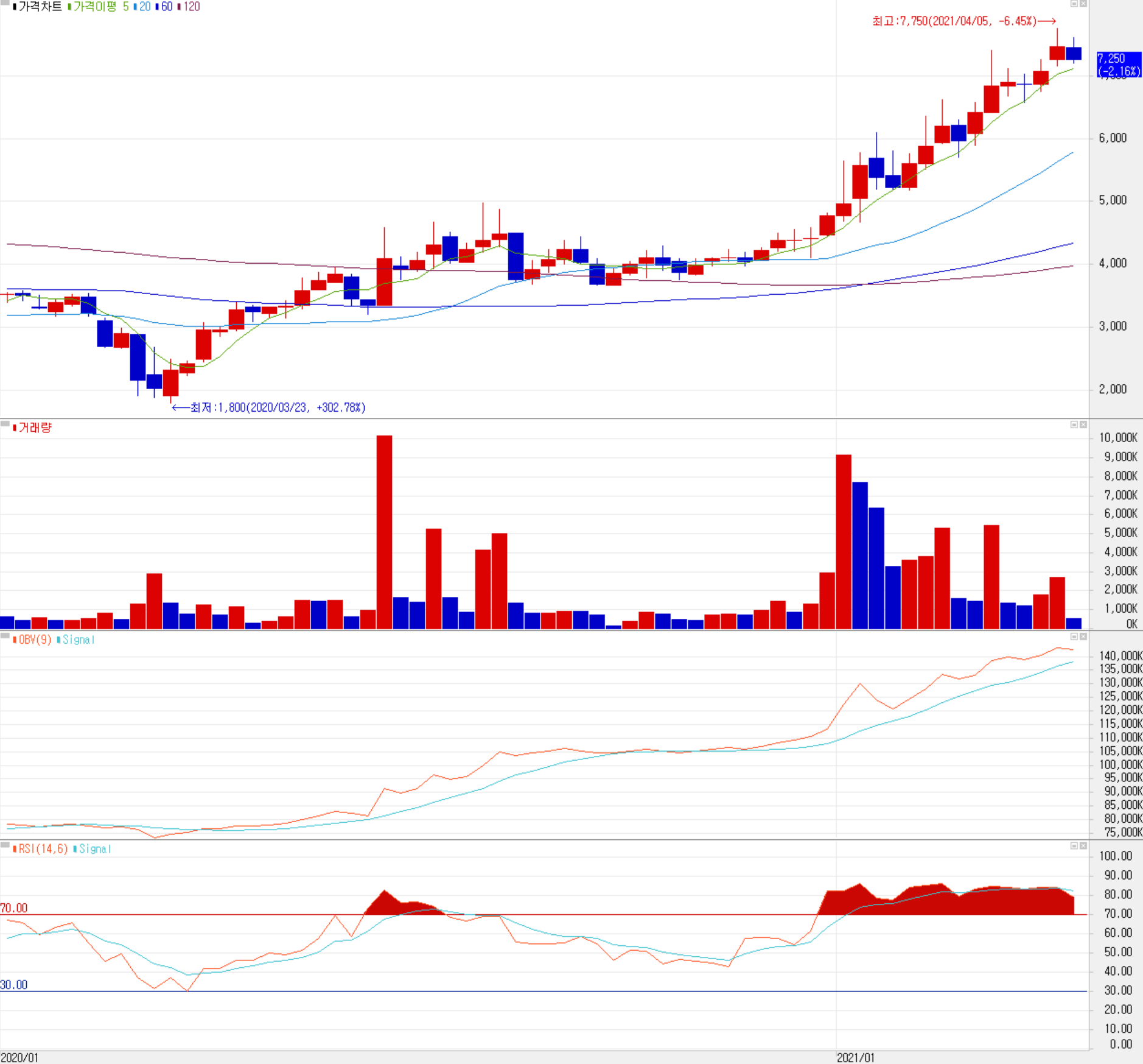 당사의 주가는 코로나19로 인한 급락 이후 현재까지, 특히 지난해 12월부터는 이상적인 패턴으로 상승 ㅜ세를 이어가고 있습니다. 올해에는 일봉, 주봉상 단기 및 중기 이평선 정배열 상태를 유지하고 있으며, 건강한 조정을 받으면서 상승하고 있습니다. 최근 한 달간 수급에서는 외국인의 매수 우위를 보이고 있습니다. 컨센서스 및 차트 관점의 소견을 종합한 개인적인 목표주가는 9,000원으로, 7,800원 부근에서 저항을 예상하고, 추가 조정 시에는 6,850원 선을 지지하는지 확인이 필요해 보입니다.