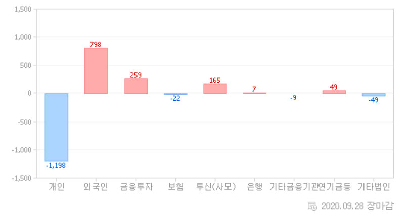 그동안의 낙폭이 너무 과했을까요? 추석 연휴 2일 전인 오늘은 몇 가지 우려와 달리 코스피(1.29%), 코스닥(3.42%) 모두 상승하면서 지난 금요일부터 반등을 보여주는 하루였습니다. 코스피는 20포인트 정도 갭상승을 두고 출발했으며, 코스닥 시장도 상승 출발을 하면서 오늘 하루 시간이 흐르면서 점점 상승픅을 키워가는 모습이었습니다. 오늘은 기관이 오랜만에 순매수로 돌아서면서 시장의 상승을 주도했습니다. 여러 가지 굵직한 대외 이슈 와중에 오늘 국내 코로나19 확진자수는 50명으로 사흘째 두 자릿수를 유지하고 있습니다.