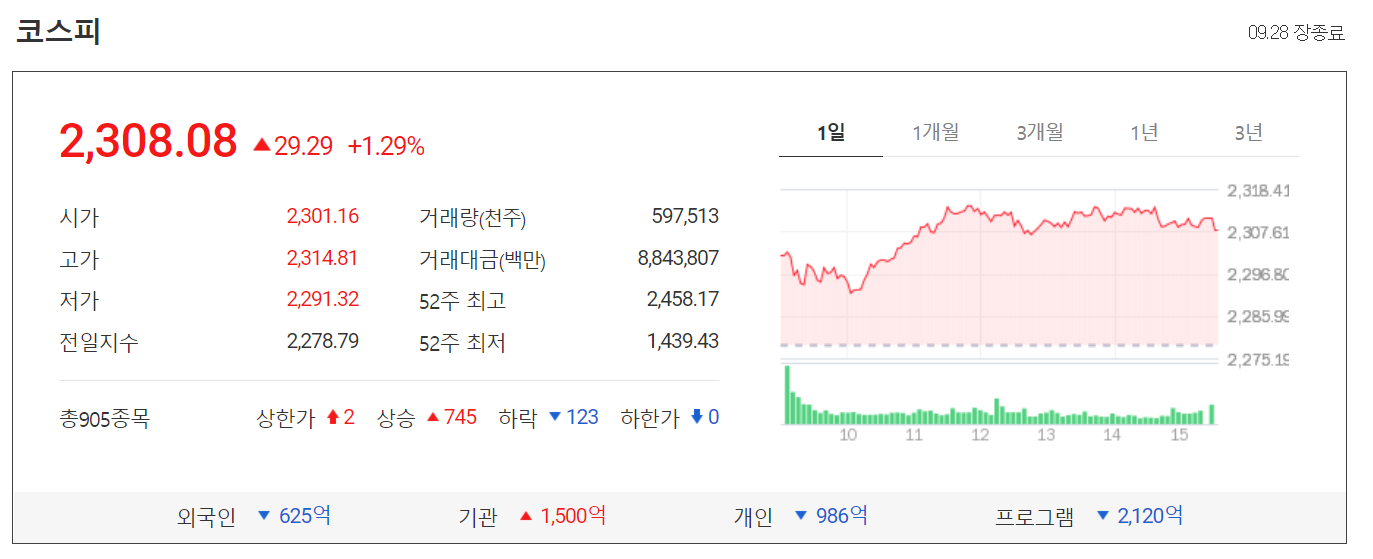 오늘 코스피 시장은 29.29포인트(1.29%)오른 2308.08에 마감하며 3일 만에 2300선을 회복했습니다.