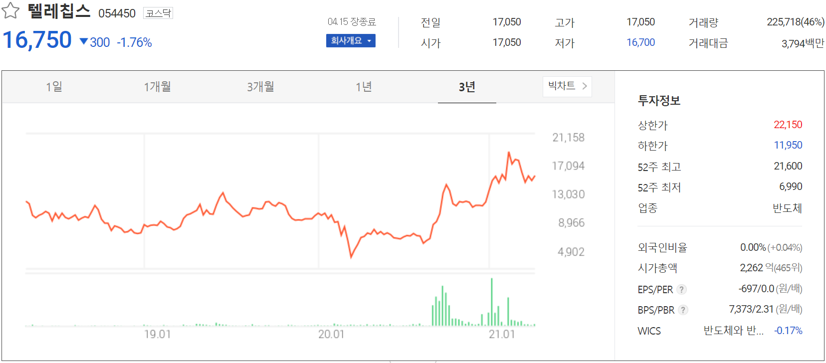 텔레칩스 주가 추이(일봉:2020.01 ~ 2021.04)