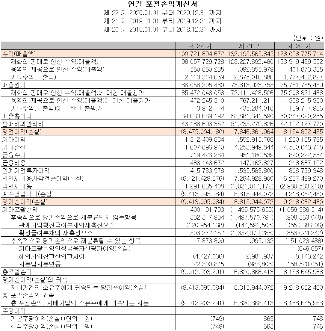 당사의 2020년 실적은 매출액 1,007억 원으로 전년 대비 23.8% 감소했고, 영업손실 85억 원 및 당기순손실 94억 원을 기록하면서 적자 전환했습니다. 코로나19 장기화에 따라 특히 Intelligent Automotive 부문의 매출이 26.8% 감소하면서 전반적인 매출 및 이익 모두 감소하였습니다.