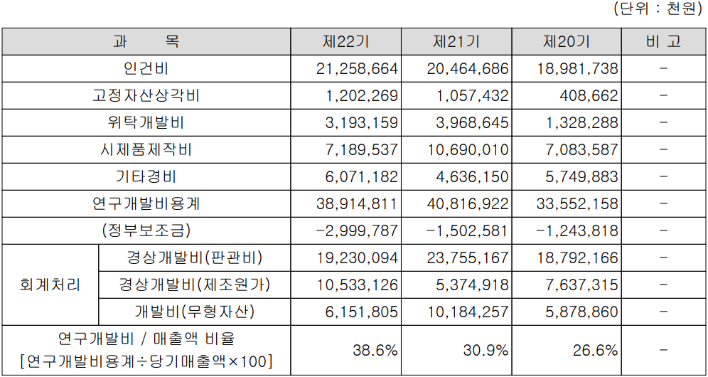 당사는 신제품 개발 및 새로운 기능의 추가를 위한 개발 비용이 점차 증가함에 따라 연구개발 투자비용이 증가하고 있습니다. 지난 2020년에는 전체 매출액의 38.6%에 해당되는 비용을 연구개발에 투자했습니다.