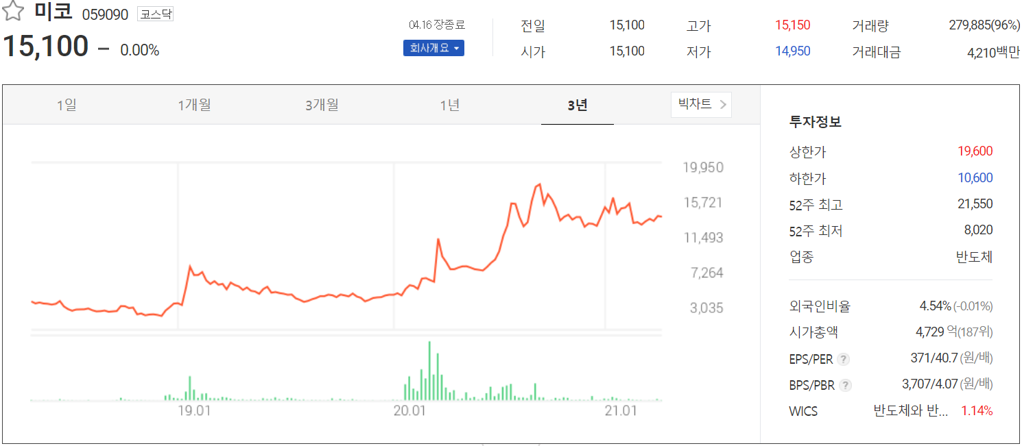 미코의 기업 분석과 적정 주가 분석 기업 개요 Profile 회 사 명 (주)미코 설 립 일 1996.02.01 대표 이사 이석윤 임직원 수 148명(2020.09) 주소 경기도 안성시 공단로 100 매출액 2361억 7014만 (2019.12) 주..