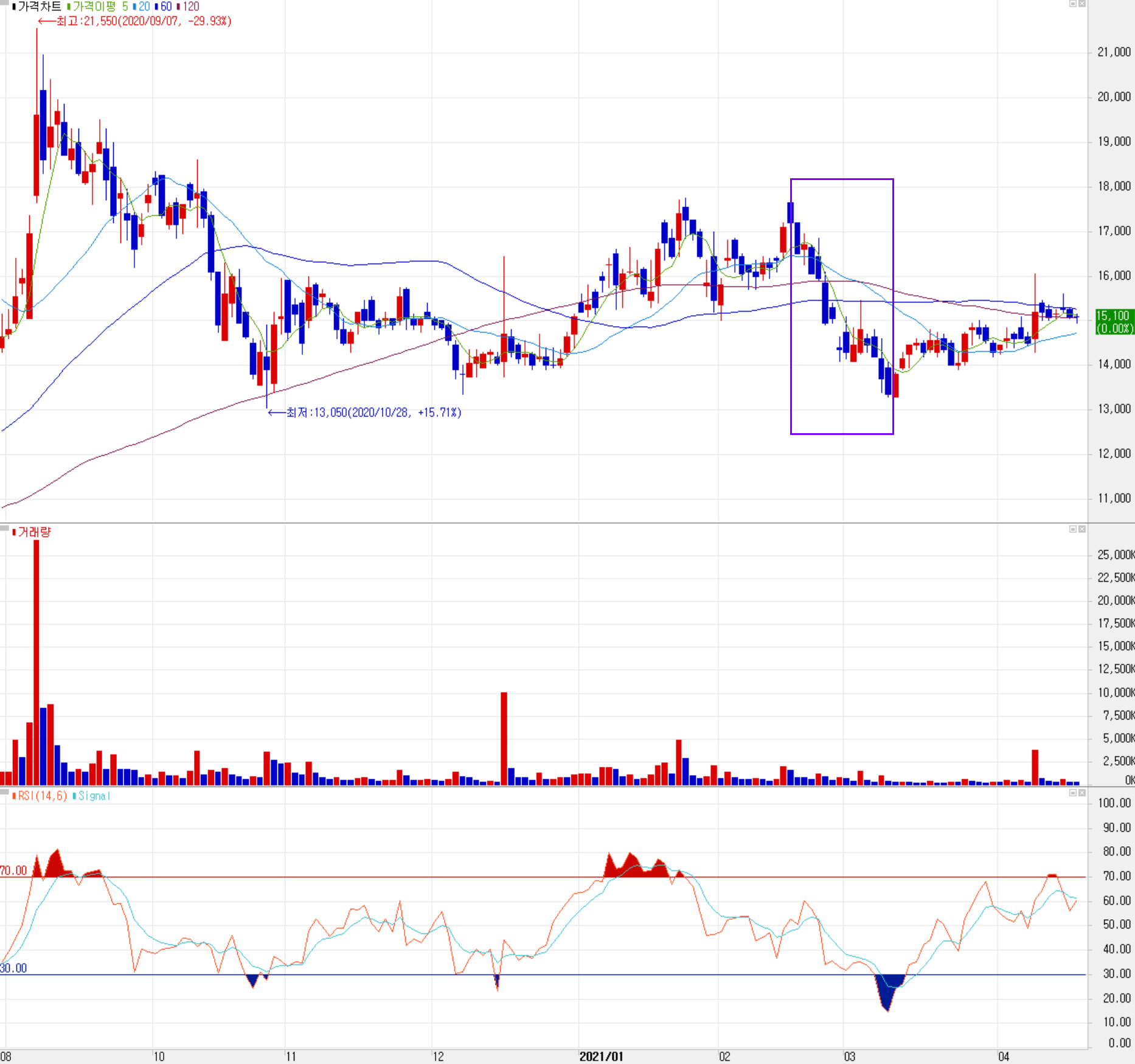 당사의 주가는 지난해 9월 한국판 그린뉴딜의 수소 테마와 함께 급등하면서 최고가인 21,550원을 기록한 후 2개월도 안된 기간 동안 13,050원까지 하락했다가 14,000~15,000원대 박스권 횡보 후 올해 1월 들어서면서 2월 중순까지 상승했습니다. 2월에는 당사의 현대중공업파워시스템 인수가 유력하다는 소식, 2020년 호실적 발표, 파생상품 거래 손실(114억 원) 등의 소식으로 비록 호실적을 거두었지만 3월 초까지 시장의 수급 조정과 함께 급락세를 보였습니다. 시장에서는 현대중공업파워시스템의 인수가 당사와 시너지 효과가 없을 것으로 판단한 것 같습니다. 또한 인수 협상에 따라 달라지겠지만, 인수자금 조달 부분도 당사의 재무상태에 부담이 될 수 있을 것으로 보고 있습니다.