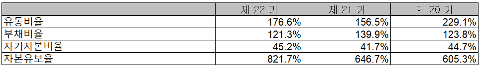 당사의 주요 재무 안정성 비율에서는 유동비율 176.6%, 부채비율 121.3%, 자기자본비율 45.2%, 자본유보율 821.7%를 기록하였습니다. 전반적으로 자산 및 부채의 규모가 증가하였으나, 미래 성장을 위한 투명성 있는 투자로 인한 증가로 인식되고 있으며, 부채비율 측면에서도 전년 대비 감소하는 등 양호한 상태로 판단됩니다.