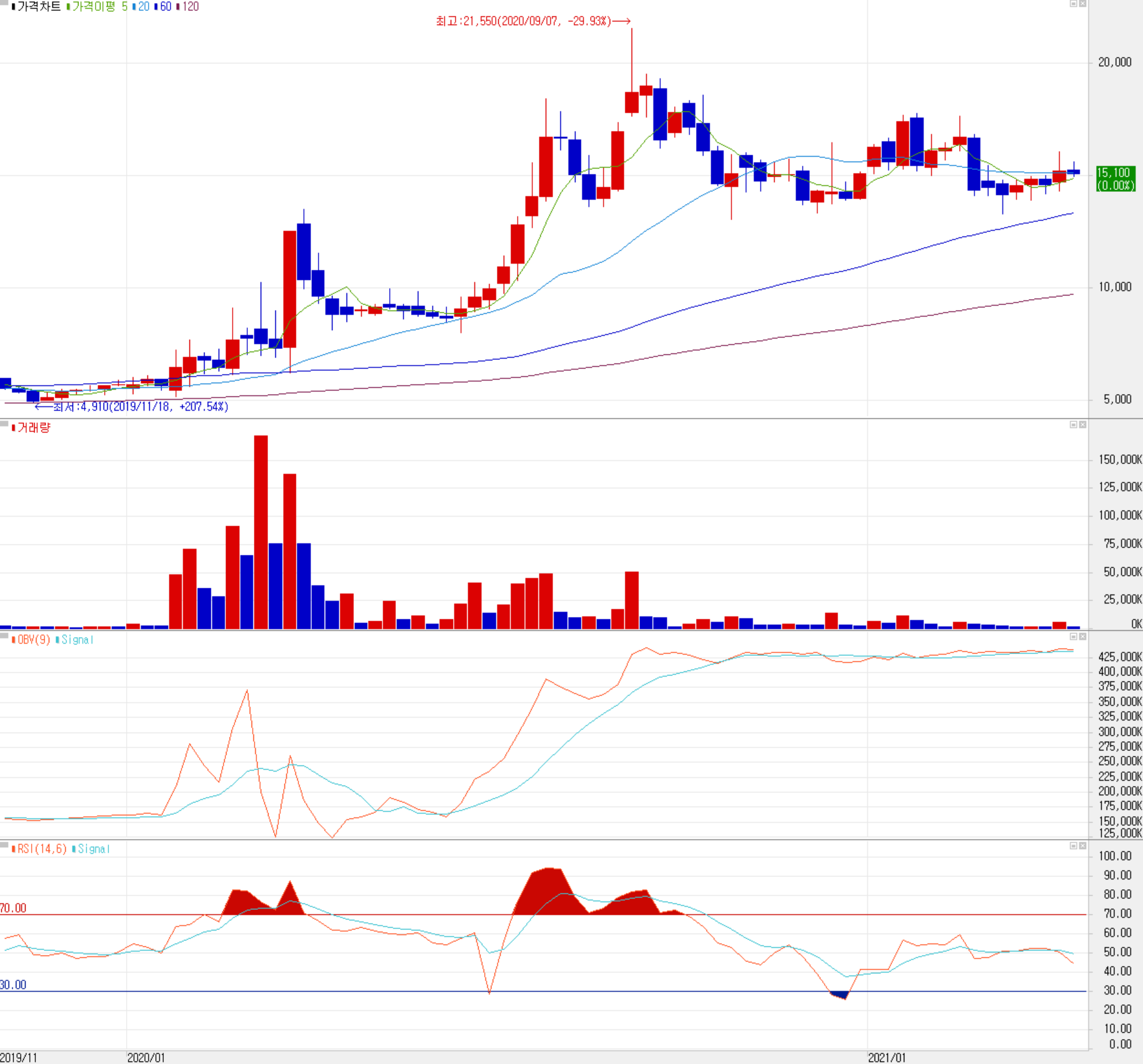 4월 16일 장종료 기준 당사의 주가는 전 거래일 종가와 같은 15,100원에 거래를 마쳤습니다. 외국인 비중은 4.54%이며, 시가 총액 4,729억 원으로 코스닥 시총 상위 187위 종목입니다.