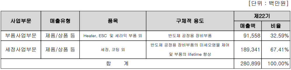 당사의 사업부문은 반도체 증착장비(CVD, Chemical Vapor Deposition)에 적용되는 고 기능성 세라믹 히터와 식각장비(Etcher)용 고기능성 세라믹 정전척(ESC) 등을 제조하는 부품 사업부문과 반도체 공정 중 세정, 코팅 등의 공정에 필요한 시스템을 공급하는 세정 사업부문으로 구분됩니다. 지난해 매출 비중은 부품 사업부문 32.59%, 세정 사업부문 67.41%를 나타냈습니다.