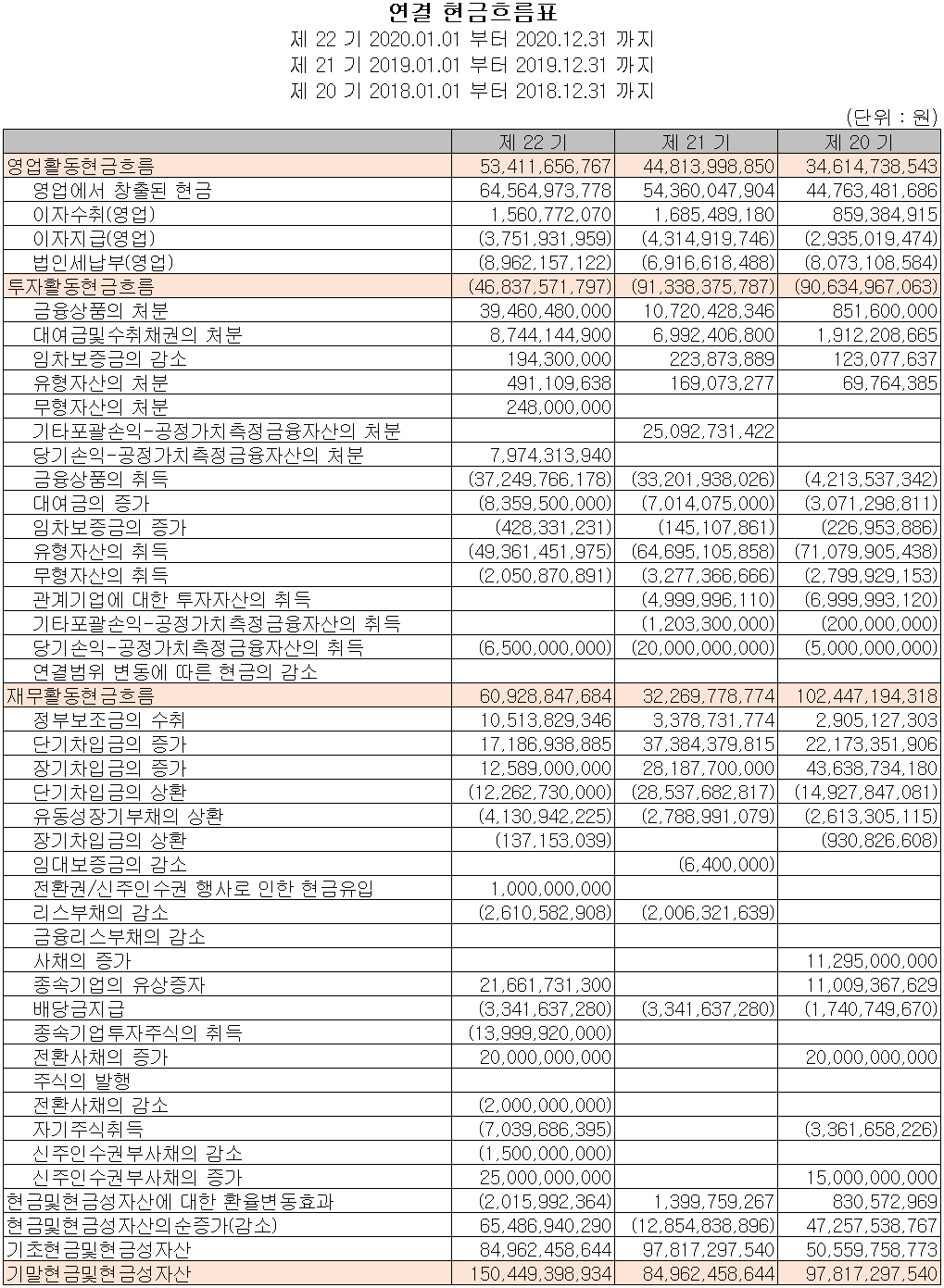 영업활동으로 창출된 현금과 장단기 차입금을 통해 연구개발 및 설비 투자를 하고 있으며, 부채의 상환 및 배당금의 지급이 이루어지고 있습니다. 2020년 당기 말 기준 당사의 현금 및 현금성 자산은 1,504억 원입니다.