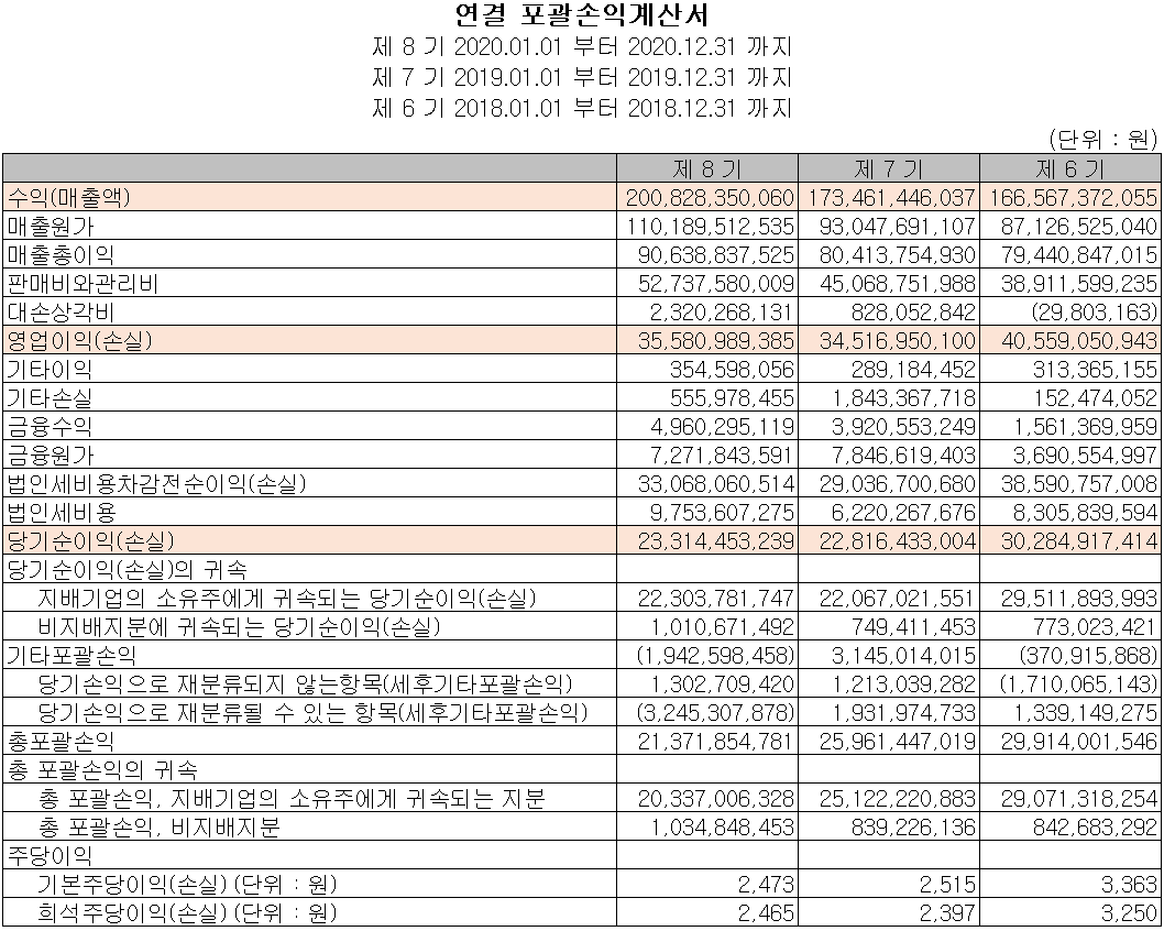 당사의 2020년 실적은 매출액 2,008억 원으로 전년 대비 15.8% 증가했고, 영업이익은 356억 원으로 3.1% 증가, 당기순이익은 2.2% 증가한 233억 원을 기록했습니다. 국내 법인 및 5 개 해외 현지법인의 매출액이 모두 전년 대비 개선되면서 전체적인 수익 증가가 있었습니다. 매출 증가 대비 영업이익이 저조한 이유는 신규 공장 증설에 따른 인건비, 감가상각비 등의 고정비 증가가 주된 요인입니다.