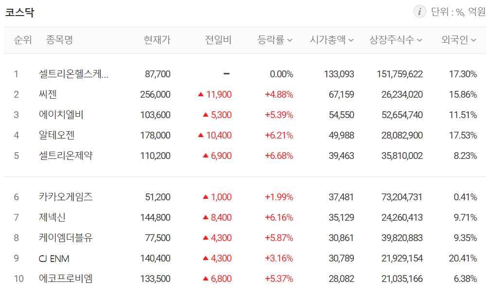 시가 총액 상위 종목 중 셀트리온 헬스케어를 제외한 모든 종목이 상승 마감했습니다.