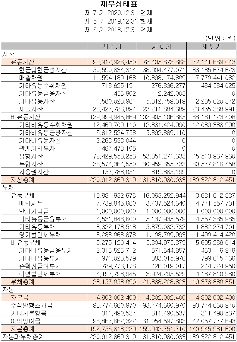 2020년 자산은 2,209억 원으로 전년 대비 21.8% 증가했습니다. 매출 증가로 인한 현금성 자산 및 매출 채권의 증가, 유형자산의 증가 등이 있었습니다. 부채는 282억 원으로 전년 대비 31.8% 증가했는데 매입채무 및 비유동금융부채 일부가 증가하였습니다.