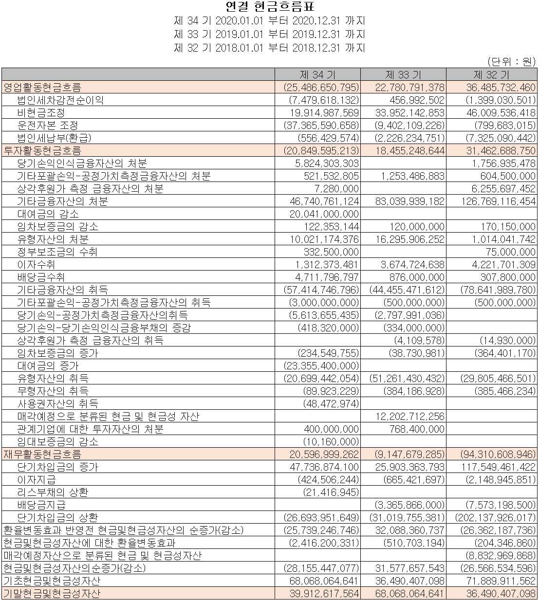 당사는 지난 3년간 지속된 적자로 인해 현금흐름은 마이너스를 보이고 있으며, 차입금을 조달하여 부채의 상환을 하고 있습니다. 2020년 당기말 기준 당사의 현금 및 현금성 자산은 399억 원입니다.