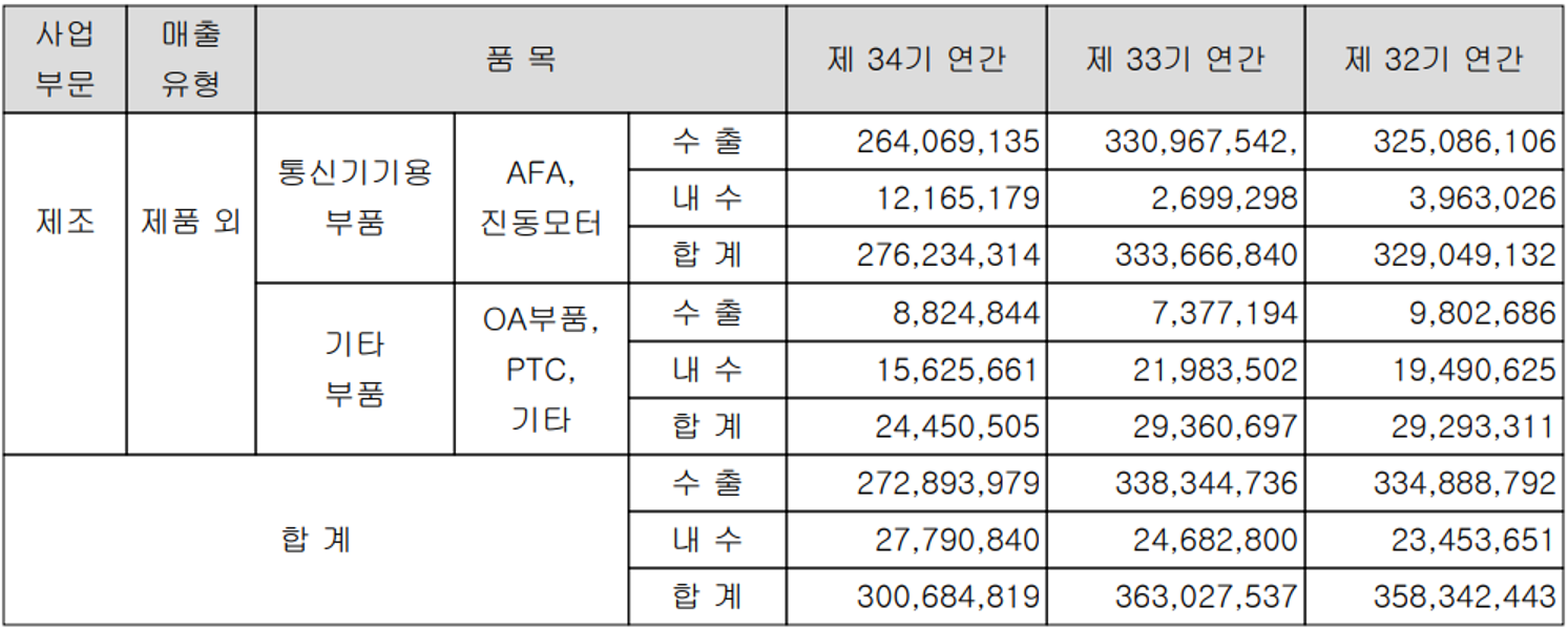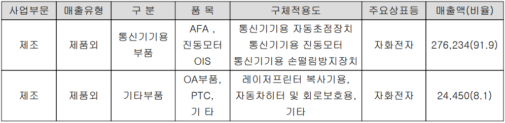 당사의 사업부문은 크게 AFA(Auto Focus Actuator), 진동모터, OIS(손떨림방지) 등의 제품을 제조 공급하는 통신기기용 부품 사업부문과 기타 자동차 PTC 히터, OA 부품 등으로 구분되어 있습니다. 지난해 통신기기 사업부문의 매출은 전체 매출의 91.9%를 차지했고, 기타 부품이 8.1%의 비중을 보였습니다.