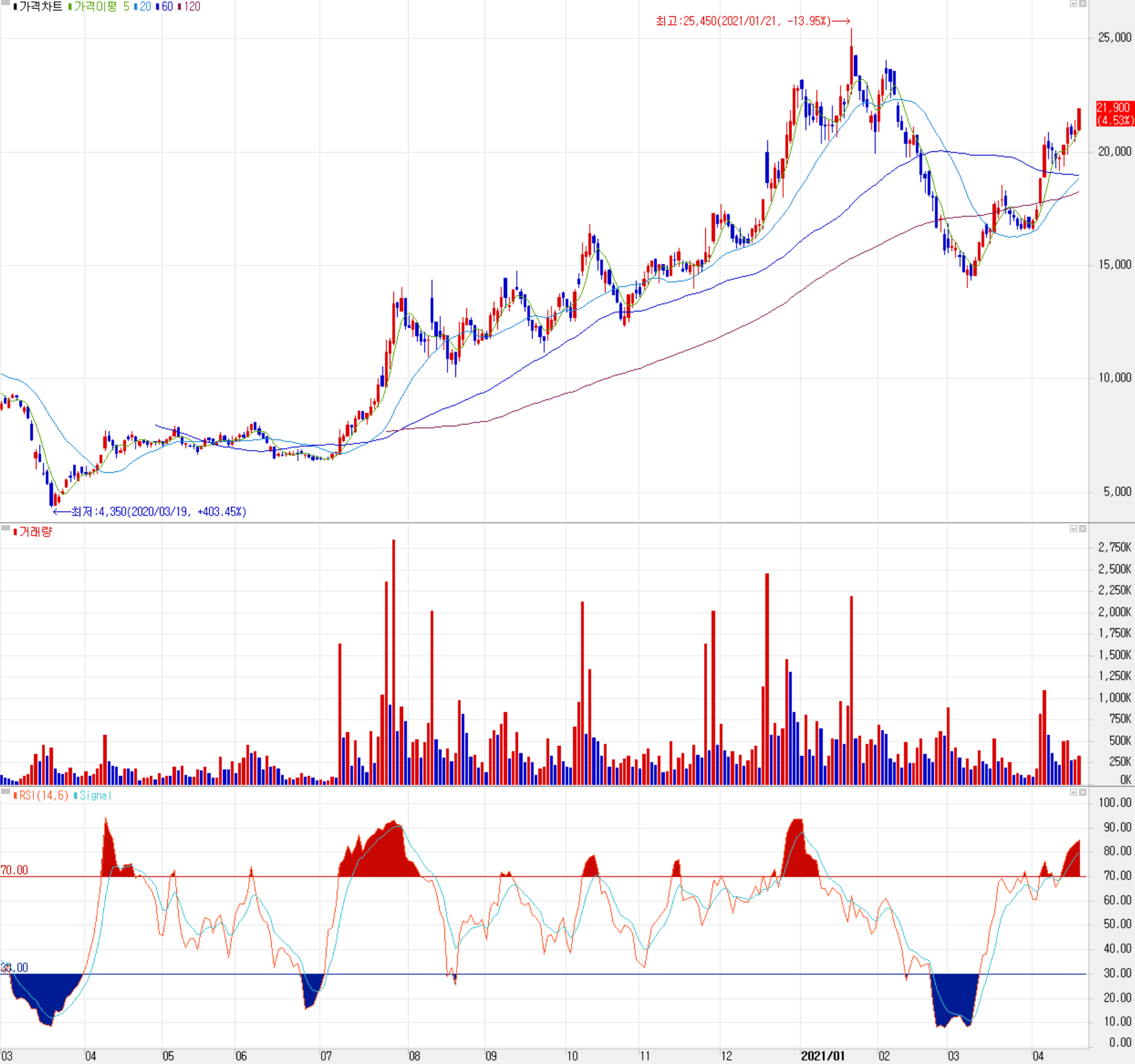 당사의 주가는 지난 2018년부터 2020년 3월 코로나19로 인한 급락까지 지속적인 실적 악화로 인한 장기간 하향 추세를 보였습니다. 2020년에는 카메라모듈 사업의 철수를 결정하고 당사의 강점인 OIS+AF 사업 및 자동차 전장 사업에 매진하기로 하면서 3분기 실적부터 턴어라운드가 예상된다는 전망에 따라 올해 2월 초순까지 꾸준한 우상향을 보였습니다. 이후 3월 초반까지는 시장 수급 변동성에 따른 조정을 받으면서 하락했으나, 3월 중순부터 최근까지 다시 상승곡선을 그리고 있습니다. 최근 수급에서는 외국인 비중이 높아지는 가운데, 기관도 매수 우위를 보이고 있으며, 개인은 매도가 강한 편입니다. 2021년 예상 실적과 차트 소견으로 개인적인 목표주가인 22,500원에 근접해있기 때문에 별도의 관점은 1분기 실적을 확인 후 재검토할 예정입니다. 단기 급등에 따른 조정 시 19,500원에서 지지하는지 확인이 필요하며, 상승 시에는 23,000원에서 저항이 예상됩니다.