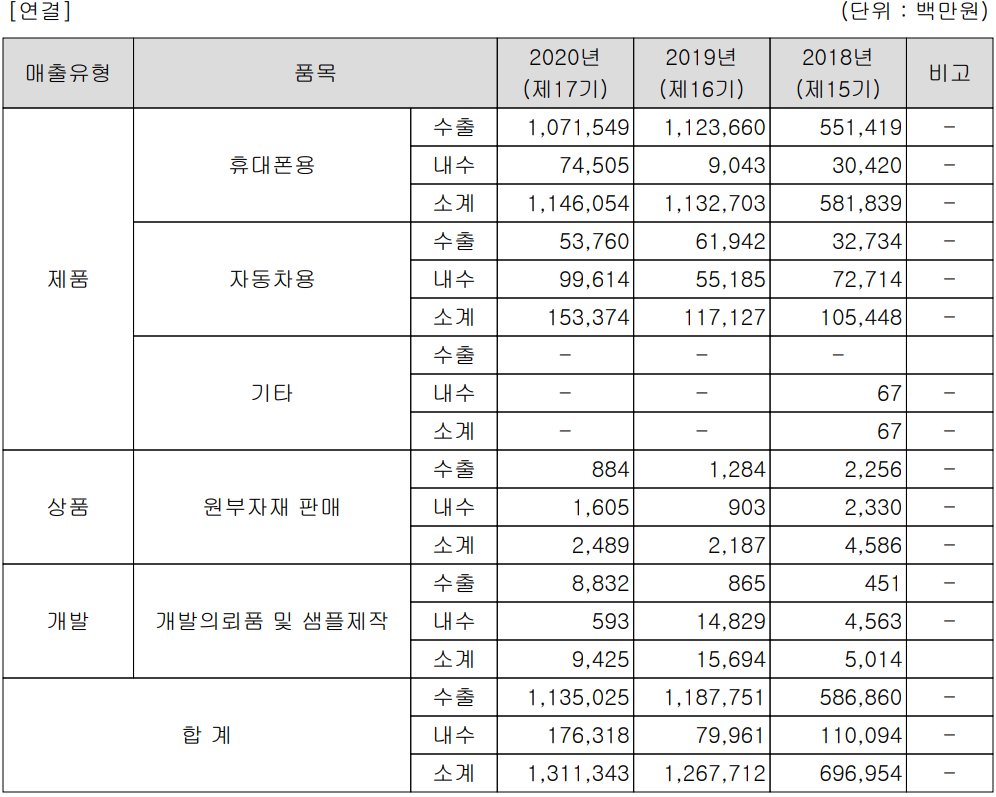 지난해 휴대폰용 부품의 수출과 내수의 비중은 각각 93.5%, 6.5%를 차지하였고, 자동차 전장의 경우 수출이 35%, 내수가 65%의 비중을 보였습니다.