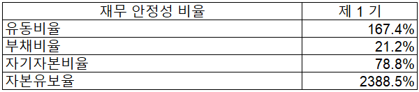 2020년 당기 말 재무 안정성 비율에서는 유동비율 167.4%, 부채비율 21.2%, 자기자본비율 78.8%, 자본유보율 2,388.5%를 기록하면서 건실한 재무상태를 유지하고 있습니다.
