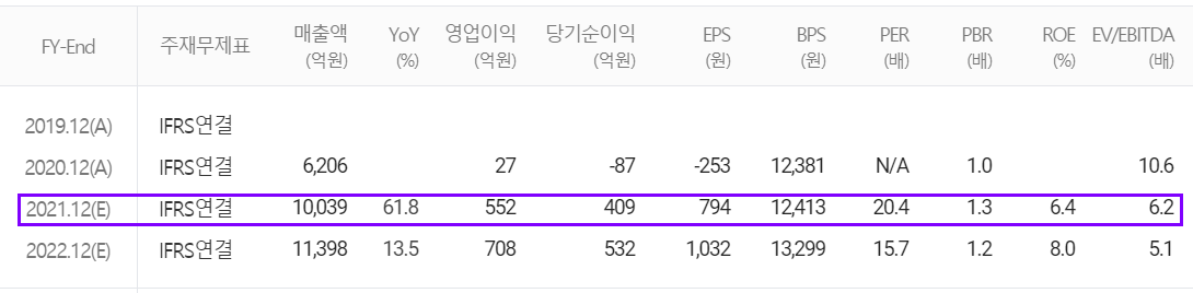 당사의 2021년 예상 실적은 매출액 1조 39억 원, 영업이익 552억 원, 당기순이익 409억 원을 추정했습니다.