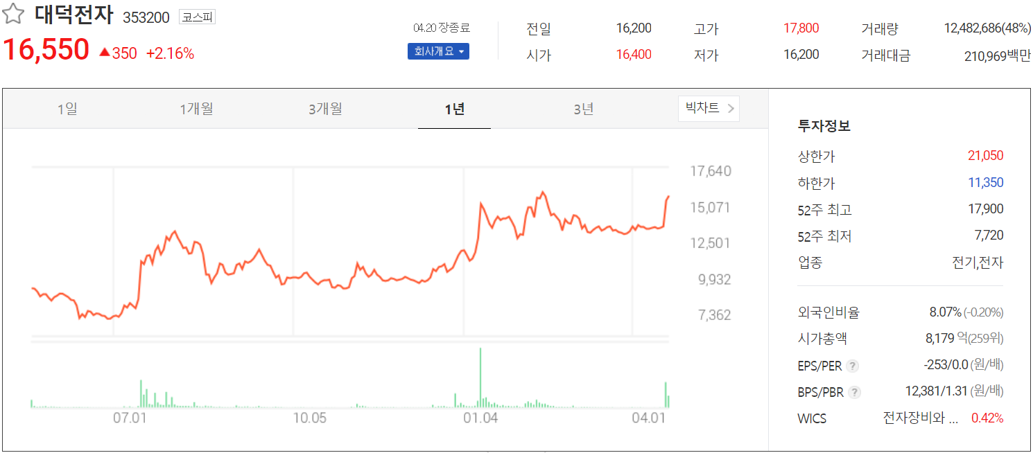 대덕전자 1우의 주가 추이입니다. 4월 들어 급등세를 보이고 있습니다.