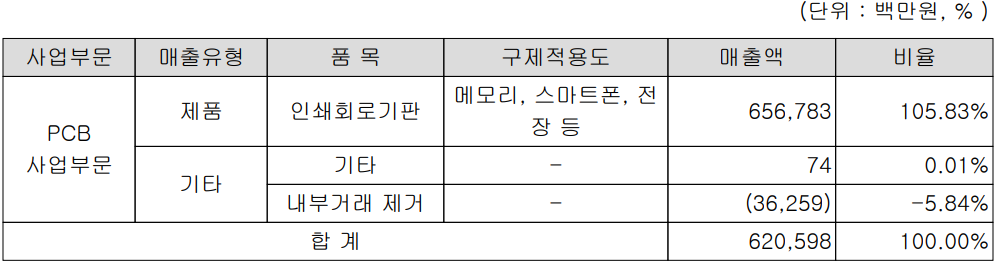 당사는 지난 2020년 5월 1일 자로 (주)대덕으로부터 PCB 사업부문을 인적 분할로 신설된 법인으로서 PCB 단일 사업 부문으로 메모리, 스마트폰, 자동차 전장 부품 등의 제품을 개발, 공급합니다. 따라서 당사의 2020년 실적은 5월부터 12월 31일까지 8개월 분의 실적입니다.