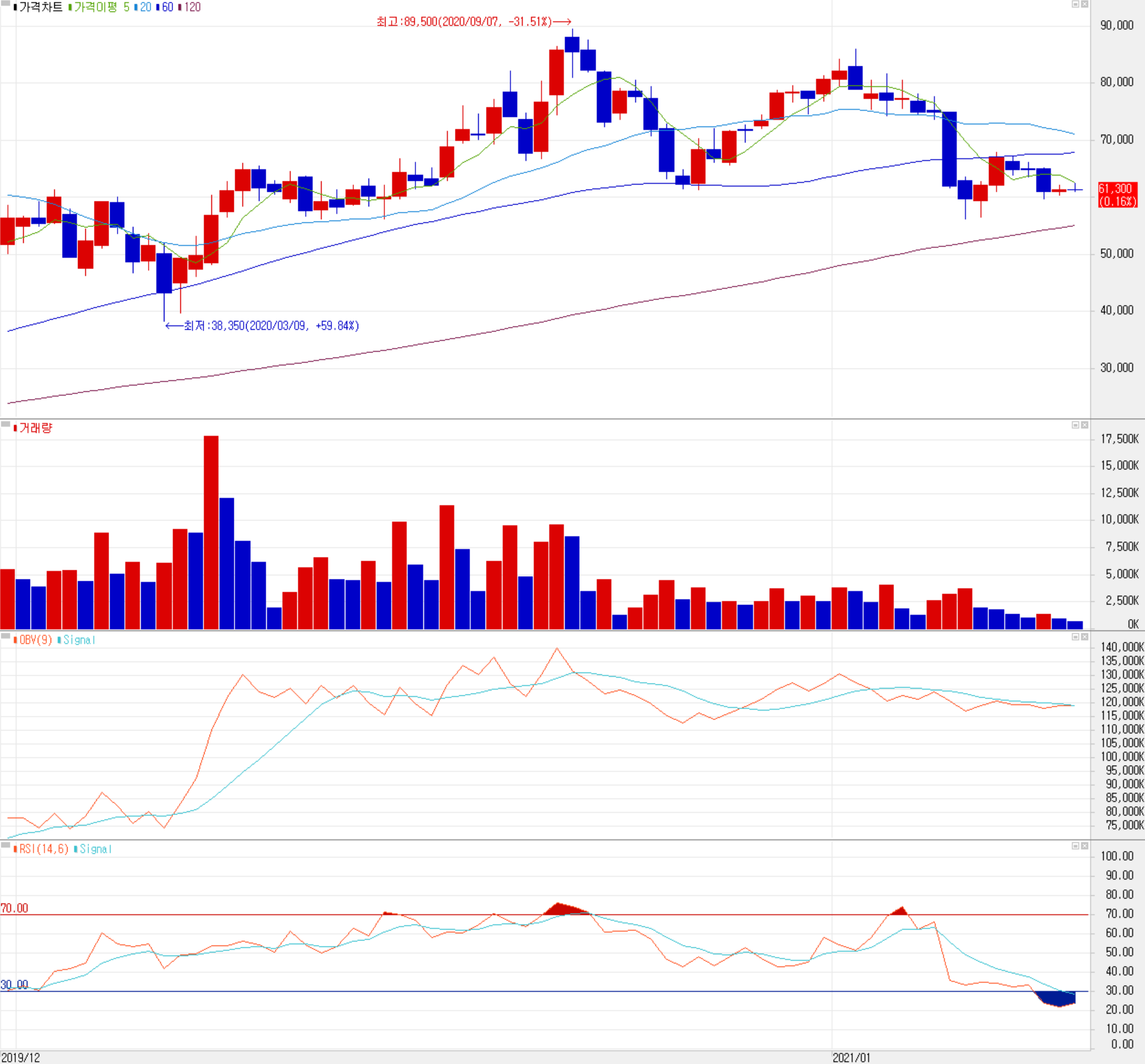 코로나19로 급락한 지난 2020년 3월 이후 빠르게 회복한 당사의 주가는 9월 8일 최고치인 89,500원을 기록한 후 현재까지 하락세를 보이고 있습니다. 지난해 코로나19의 충격에서 벗어나기 위한 범정부 차원의 정책에 따른 기대감이 주가를 끌어올렸으나, 코로나19 상황이 지속되면서 실적 감소에 따라 주가가 큰 힘을 받지 못하다가 지난해 11월 삼성전자가 미국 버라이즌과 7.9조 원 규모 장비 공급계약을 체결했다는 소식에 주가가 급등하였으나, 상승폭 이상으로 급락하면서 현재에 이르고 있습니다. 최근 수급에서는 개인의 매수가 활발한 가운데, 기관과 외국인은 매도 우위를 보이고 있습니다. 예상실적 및 차트 소견을 종합한 개인적인 목표주가는 77,000원으로 설정하였고, 상승 시 65,000원에서 1차 저항을 예상하며, 하락 시에는 59,000원 부근에서 1차 지지를 보고 접근할 예정입니다.