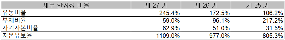 당사의 주요 재무 안정성 비율 면에서는 유동비율 245.4%, 부채비율 59%, 자기자본비율 62.9%, 자본유보율 1,09%를 기록하면서 안정적인 재무상태를 유지하고 있습니다.