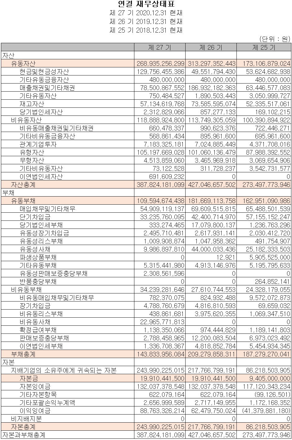 2020년 당기 말 기준 당사의 자산은 전년 대비 392억 원이 감소한 3,878억 원으로 전반적으로 당기 매출 하락으로 인한 매출 채권 및 재고 자산의 감소에 따른 자산 감소가 있었습니다. 부채는 전기 대비 665억 원 감소한 1,438억 원으로, 차입금의 상환, 매입채무의 감소에 따라 유동부채가 720억 원 감소하였습니다.
