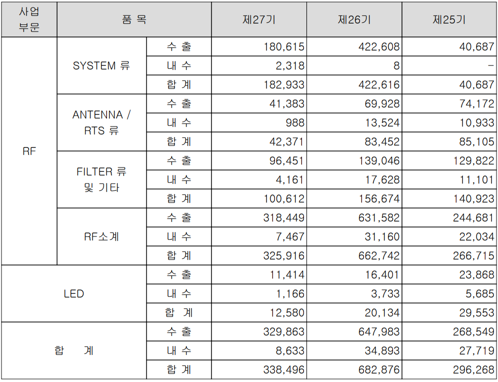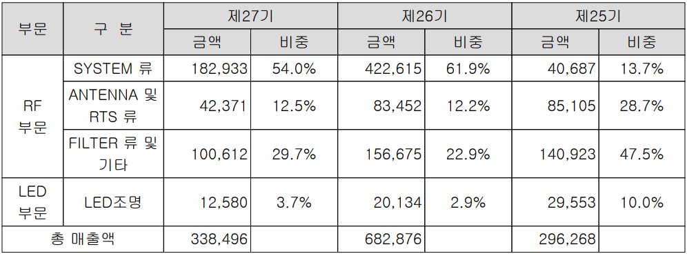 당사의 사업 부문은 크게 RF(무선) 부문과 LED 부문으로 구분됩니다. RF부문에는 MMR(Massive MIMO Radio) 장비 등 시스템 류와, 안테나 그리고 무선통신 필터 등으로 구성되어 있습니다. 지난해 시스템 류의 매출은 전체 매출액의 54%, 안테나 12.5%, 필터 류 29.7% 및 LED 조명 부문 3.7%의 매출 비중을 나타냈습니다.