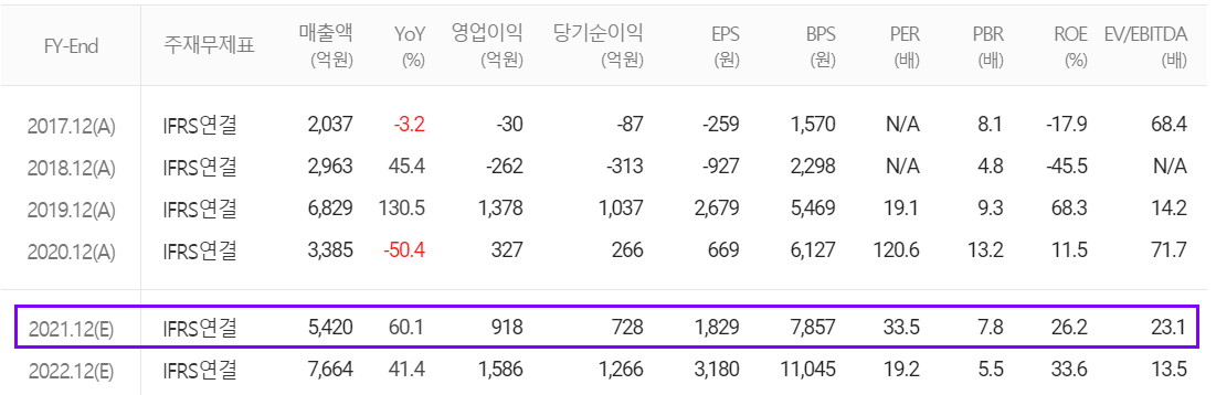 당사의 2021년 예상 실적은 매출액 5,420억 원으로 전년 대비 60.1% 증가하고, 영업이익 918억 원으로 180.7% 증가, 당기순이익은 173.7% 증가한 728억 원을 기록할 것으로 추정했습니다. 5G 관련 투자 재개로 2021년 후반기로 가면서 2022년 본격적인 전방 산업의 투자 효과를 볼 것으로 예측하는 것 같습니다.