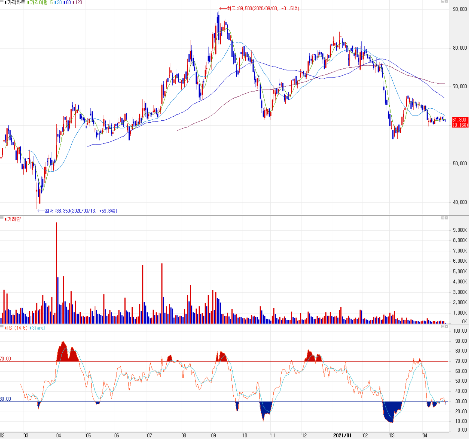 코로나19로 급락한 지난 2020년 3월 이후 빠르게 회복한 당사의 주가는 9월 8일 최고치인 89,500원을 기록한 후 현재까지 하락세를 보이고 있습니다. 지난해 코로나19의 충격에서 벗어나기 위한 범정부 차원의 정책에 따른 기대감이 주가를 끌어올렸으나, 코로나19 상황이 지속되면서 실적 감소에 따라 주가가 큰 힘을 받지 못하다가 지난해 11월 삼성전자가 미국 버라이즌과 7.9조 원 규모 장비 공급계약을 체결했다는 소식에 주가가 급등하였으나, 상승폭 이상으로 급락하면서 현재에 이르고 있습니다. 최근 수급에서는 개인의 매수가 활발한 가운데, 기관과 외국인은 매도 우위를 보이고 있습니다. 예상실적 및 차트 소견을 종합한 개인적인 목표주가는 77,000원으로 설정하였고, 상승 시 65,000원에서 1차 저항을 예상하며, 하락 시에는 59,000원 부근에서 1차 지지를 보고 접근할 예정입니다.