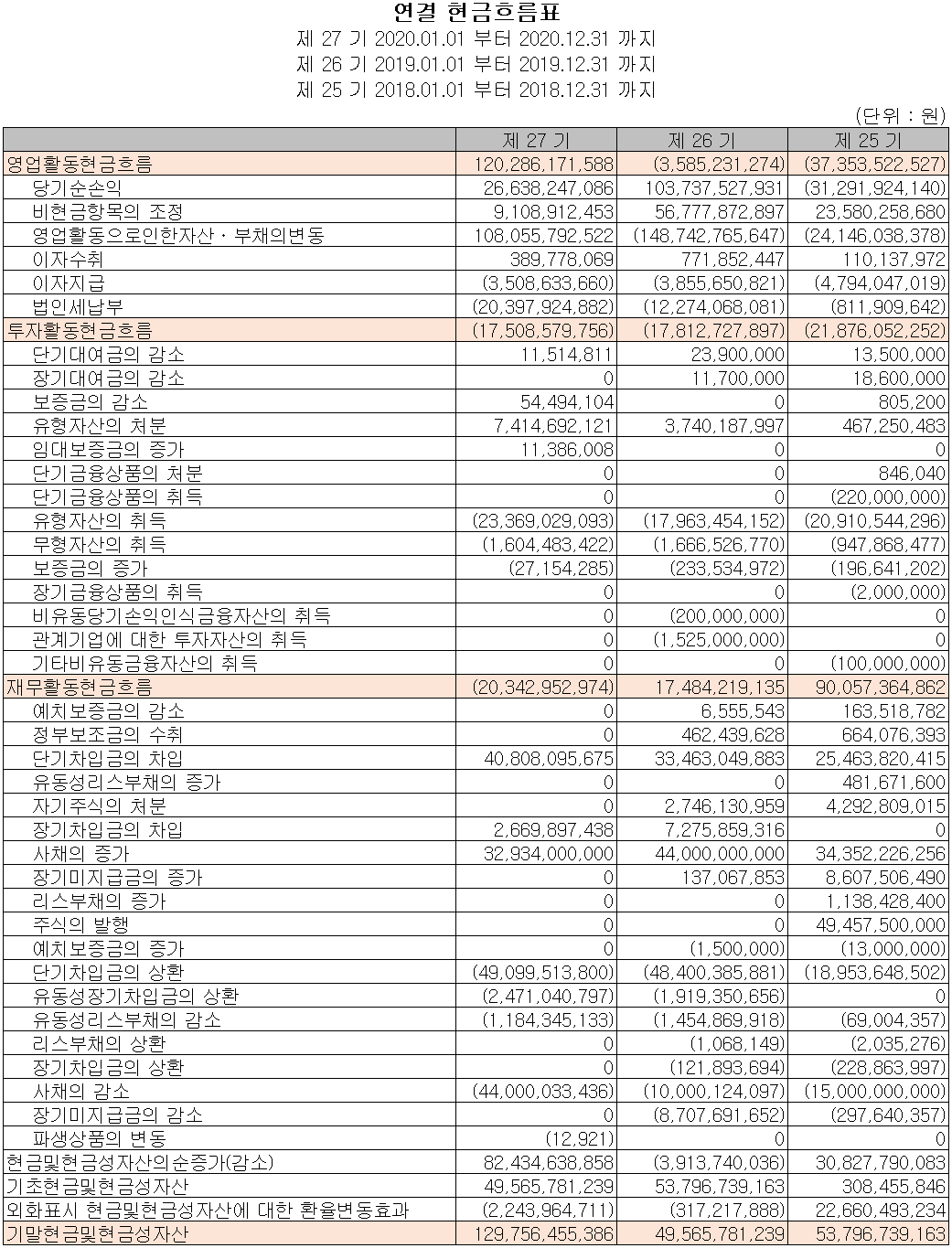 영업활동으로 현금을 창출하였으며, 차입금과 사채(330억 원)발행을 통한 자금을 조달하여 부채의 상환 및 연구개발과 설비에 투자하고 있습니다. 2020년 당기 말 기준 당사의 현금 및 현금성 자산은 1,298억 원입니다.