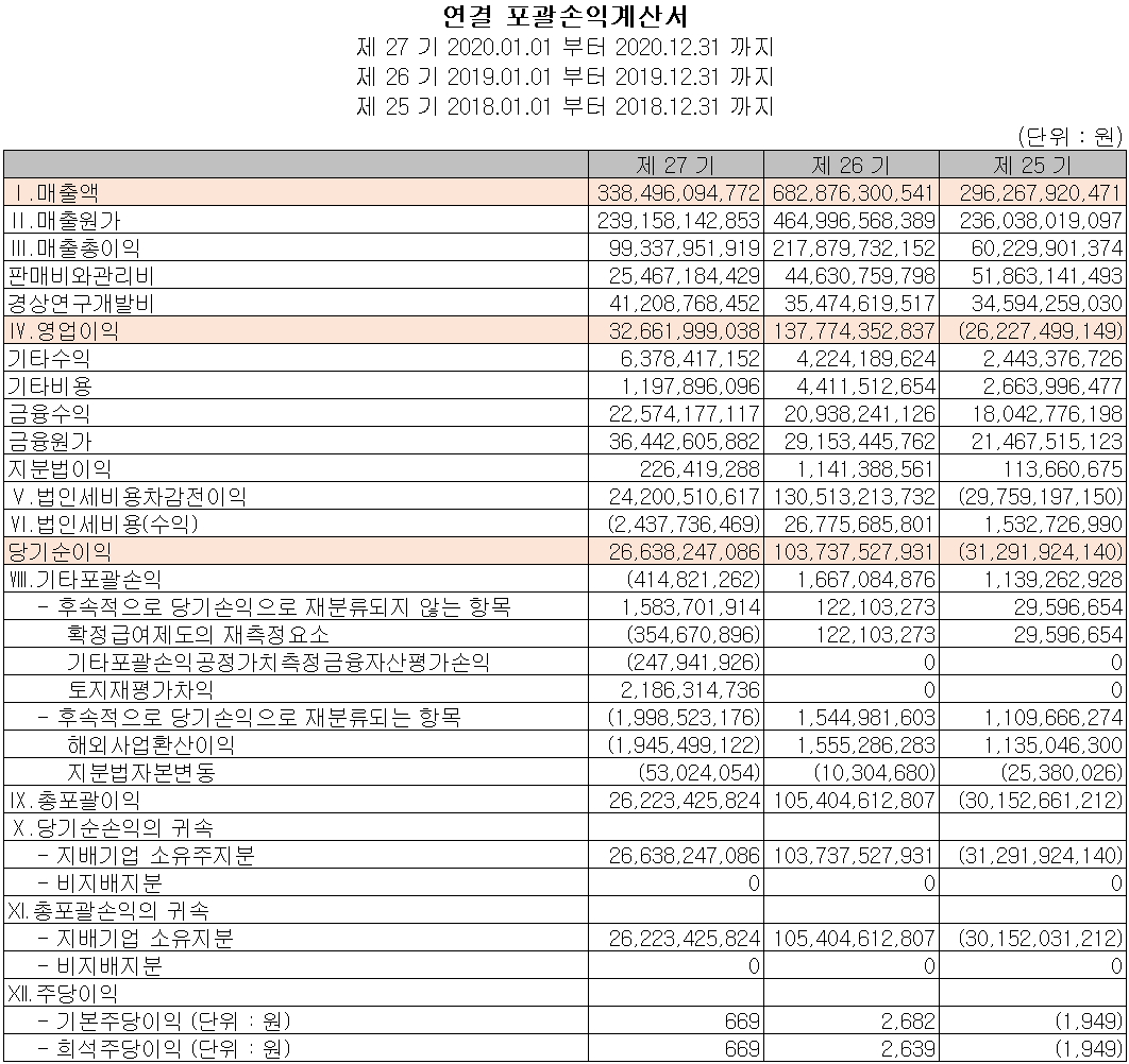 당사의 2020년 실적은 3,385억 원으로 전년 대비 50.4% 감소했고, 영업이익은 327억 원으로 76.3% 감소, 당기순이익은 266억 원으로 74.3% 감소했습니다. 코로나19 및 5G 전방산업의 투자 지연에 따른 매출 감소가 주요 실적 부진의 요인을 파악됩니다.