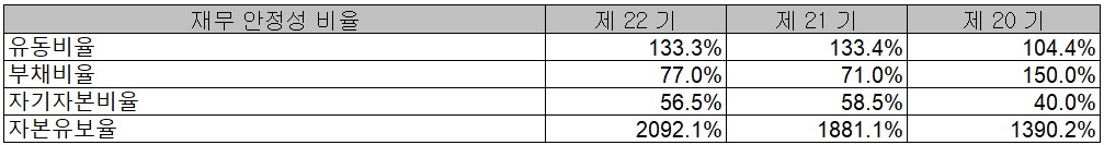 당사의 주요 재무 안정성 비율면에서는 유동비율 133.3%, 부채비율 77%, 자기자본비율 56.5%, 자본유보율 2,092.1%를 기록하면서 안정적인 재무상태를 유지하고 있습니다.