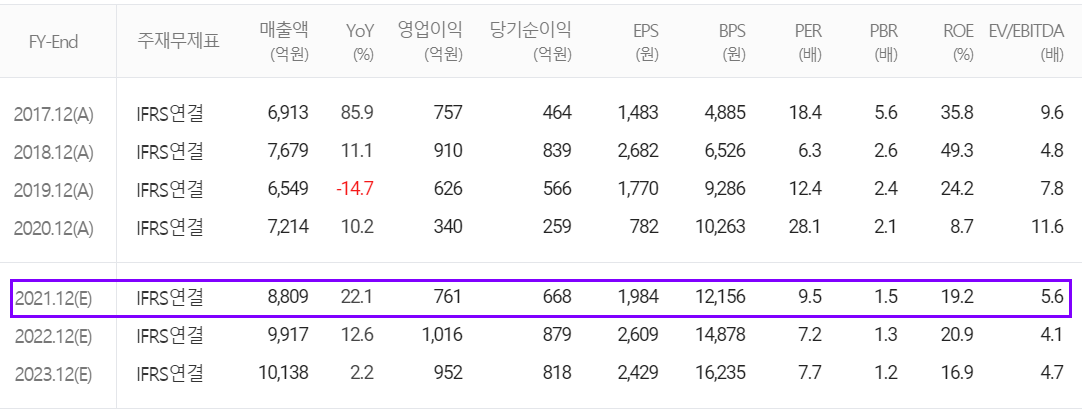 당사의 2021년 예상 실적은 매출액 8,809억 원으로 전년 대비 22.1% 증가하고, 영업이익은 761억 원으로 123.8% 증가, 당기순이익은 158% 증가하면서 668억 원을 기록할 것으로 추정했습니다.